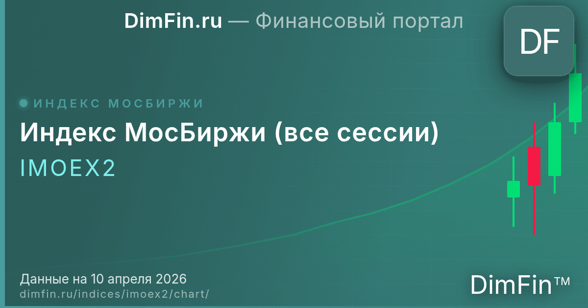 Интерактивный график Индекс МосБиржи (все сессии) (IMOEX2) отображает динамику индекса в режиме свечного графика. Каждая свеча показывает цену открытия, максимум, минимум и закрытие за выбранный период. Зелёные свечи означают рост, красные — снижение. По состоянию на 09.04.2026, Индекс МосБиржи (все сессии) находится на уровне 2 740,42 п., доходность за последний год составила −1,60%.