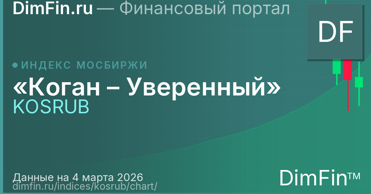 Интерактивный график «Коган – Уверенный» (KOSRUB) отображает динамику индекса в режиме свечного графика. Каждая свеча показывает цену открытия, максимум, минимум и закрытие за выбранный период. Зелёные свечи означают рост, красные — снижение.