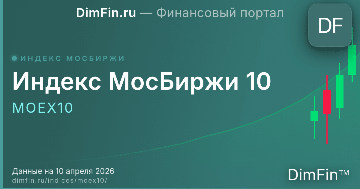 Индекс МосБиржи 10 (MOEX10) показывает поведение российского фондового рынка. В его состав входят 10 наиболее ликвидных акций крупнейших российских компаний, включая ПАО Банк ВТБ, ПАО Сбербанк, ПАО Газпром, ПАО ИКС 5 и ПАО Южуралзолото. На ПАО Банк ВТБ (11,0%), ПАО Сбербанк (10,3%) и ПАО Газпром (10,3%) (и ещё 2 компании) приходится 51,9% веса индекса. Рассчитывается с 19 марта 2001 года — за 28 лет индекс прошёл через несколько экономических циклов, включая кризисы 2022, 2008, 1998. Базовое значение на старте составляло 100,00 п., текущее — 5 359,54 п. (+5 047,46% за всё время). Выступает основным ориентиром российского рынка акций: к нему привязаны ETF, паевые фонды и стратегии профессиональных управляющих.